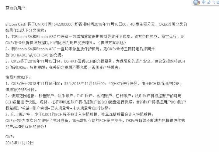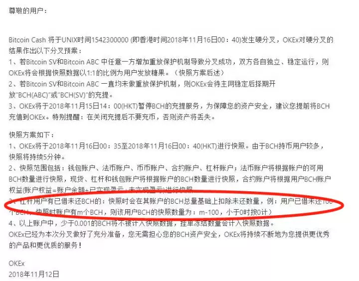 3. OKEx 接着公布了借出 BCH 的用户现在需要将 ABC 和 BSV 都退还给交易所的公告。
