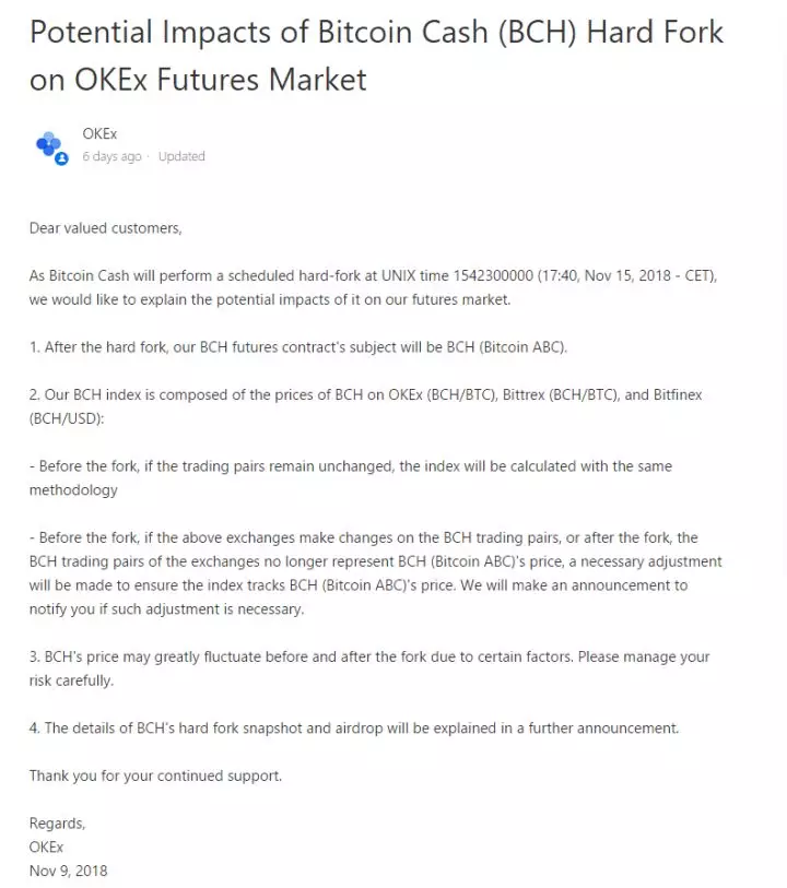 OKEx 在分叉之前决定了他们的立场,发公告声明:「硬分叉结束之后,我们的 BCH 期货合约将支持 BCH(比特币 ABC)」。