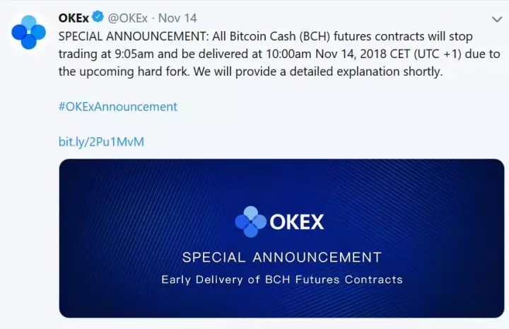 OKEx 同时宣布将于 2018 年 11 月 14 日上午 09:05 CET(UTC +1)的最后交易价格中提前交割 BCH 期货合约,而不是按规则允许市场自由浮动或继续执行限价规则。完整的公告可以在这里阅读: