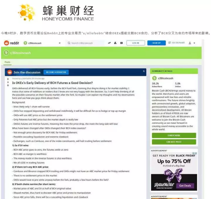 这篇文章引用了 Reddit 上的一则帖子。一个自称立场中立的散户 u/Allofoobtc 写了一篇很长的解释,讲解了 OKEx 提早交割各个 BCH 合约的原因。而这篇帖子的风格、口气和内容都与 OKEx 自己发布的解释极度相同。这个 Reddit 帖子发表的时间和蜂巢财经发表文章的时间相隔了 2 个小时。