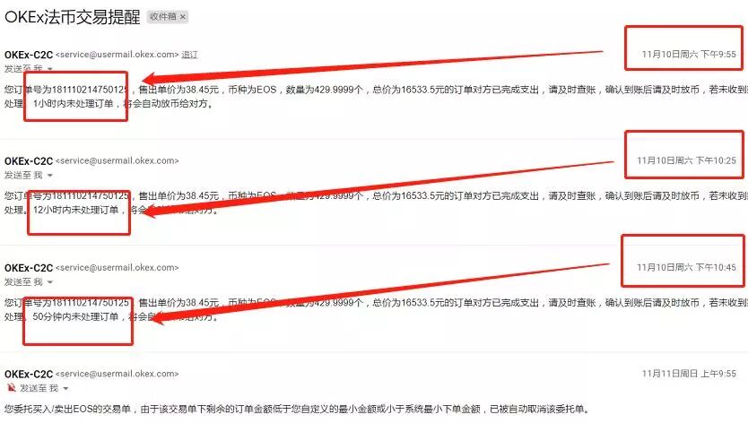 小珺在整理邮箱时,发现案发当天晚上,OKEx给自己发来的3封邮件中,连倒计时都是混乱的。